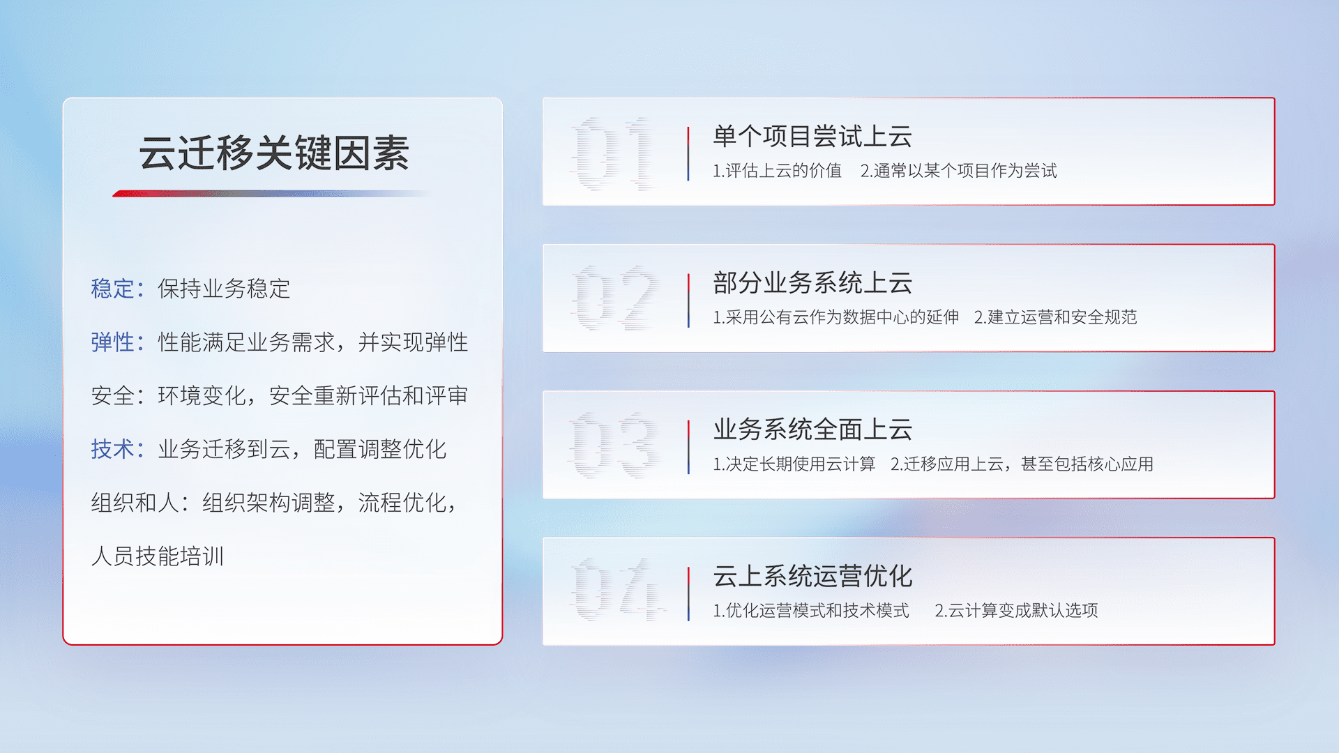 结合实际业务,,,,从规划设计、、、、云平台选型、、、云原生改造、、、数据迁移、、、集成交付,,迁移全过程为客户识别最佳上云路径,,,,做好风险识别管理,,,设计网络架构、、、身份权限、、、、安全审计合规、、、操作审计、、日志审计、、、、监控告警策略、、、、多站点容灾设计等,,对云上基础设施进行整体规划,,,提升IT治理水平,,以满足弹性、、、、高可用、、、、高性能的需求。。。。