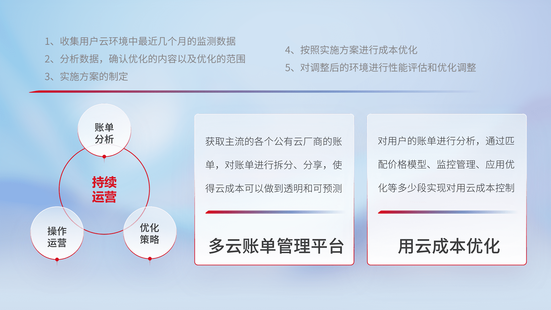 通过多云纳管,,以统一的资源数据模型把客户的云资源进行抽象和封装,,,,进而实现对多云资源的统一操作,,保障云资源管理的可靠性、、、、稳定性与可用性。。。。量身定制化运维内容,,,配置、、、、开发运维、、、、补丁管理、、备份、、监控、、、认证和访问管理、、审计和日常巡检等,,,保障在用云过程中的可靠度,,,,稳定度以及高可用率。。